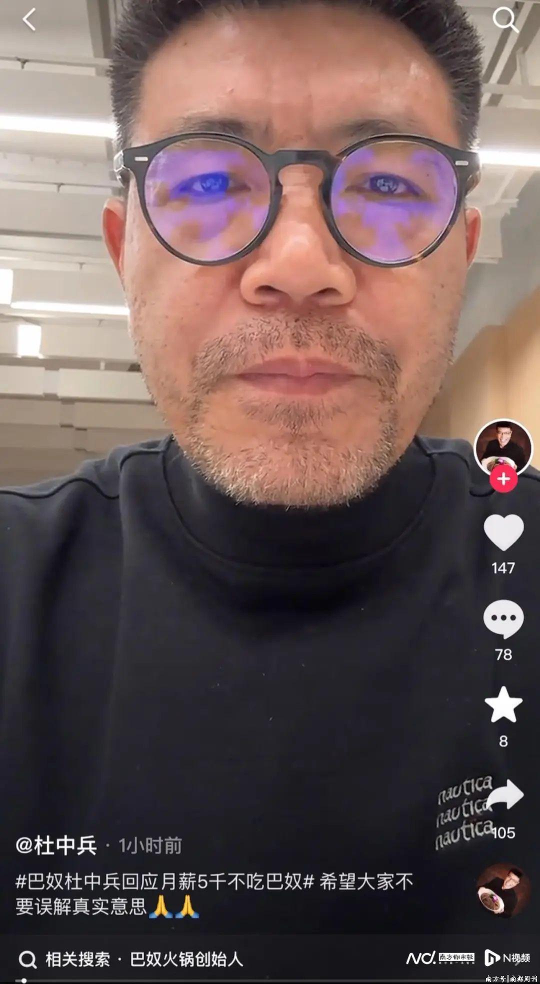 2月26日,杜中兵通过个东说念主视频账号修起此事,合计是被误解意旨兴味。杜中兵默示,“我昨天说到‘暖锅不是办事底层东说念主民的’,‘月薪5000块钱就不要吃暖锅,吃些麻辣烫就好了’等等。这几句话不是连在一皆说的,如若连在一皆说,就把我的信得过本意给误解了。”