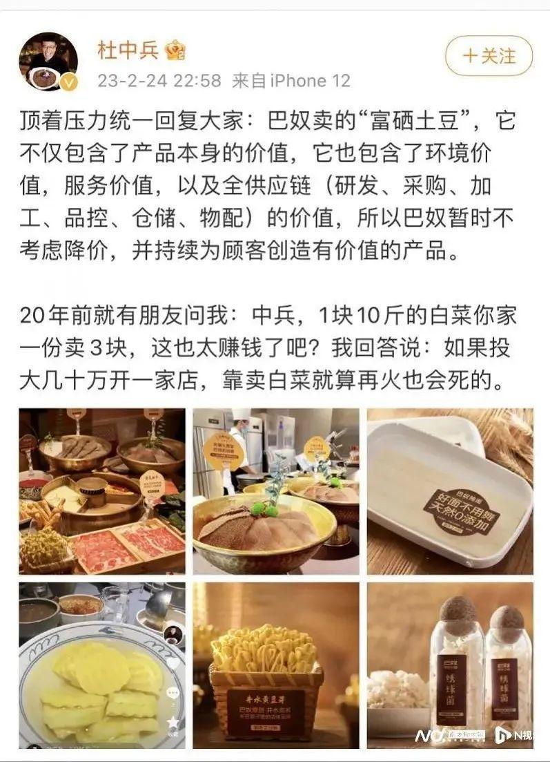 杜中兵也通过微博再次修起土豆争议,其称,巴奴卖的“富硒土豆”,它不仅包含了产物自身的价值,它也包含了环境价值、办事价值,以及全供应链的价值,是以“巴奴暂时不筹商降价,并合手续为主顾创造有价值的产物。”