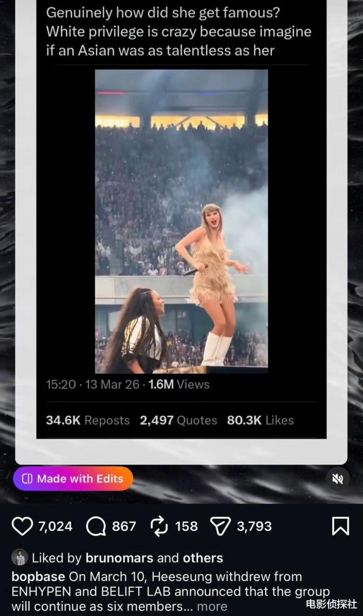事情是这么的:前几天,一张截图在外网疯传,浮现火星哥点赞了一条对于霉霉的“黑帖”,这条帖子配了一段霉霉的扮演视频,但案牍却尽头忽闪:“赤忱不懂她咋出名的?白东说念主的特权太狂妄了,念念象一下淌若一个亚裔像她相似没才华会若何。”