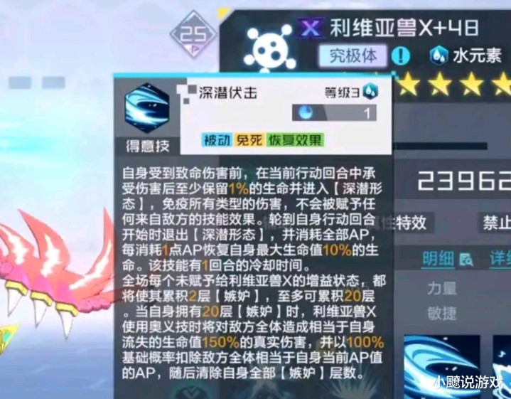 风景技则是个保命手段,也等于宣传时提到的“深潜免死”,当受到致命伤害时,触发锁血成果,深远水里,当轮到本身的回合时,才会出现,之后耗尽所有 AP 来复原人命值,有 1 回合冷却。由此看来,利维亚兽 X 亦然个难杀的主。