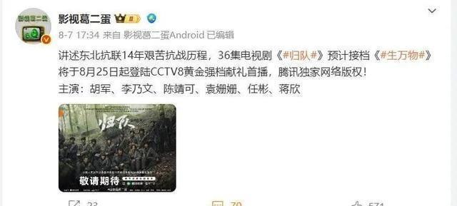 胡军、林永健、蒋欣、倪大红、刘佩琦……一开阔戏骨联手,把东北抗联的热血与顽强搬上了央视黄金档——36集历史大剧《归队》,将在这个八月燃情亮相。 这部为记挂抗日战役顺利80周年而生的作品,从开机到定档扫数备受防护,不光是声势够硬,更因为它融会地把那段没世不忘的历史拉回到你我目下,让东说念主心头一热,眼眶一酸。 2024年9月,《归队》在白山市崇敬开机,剧组沿浑江区、江源区、临江市一带,选了二十多处取景地,搭起了能遮风挡雪的实景基地。
