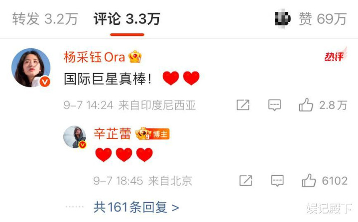 这一事件一出来奏凯让刘亦菲和辛芷蕾之间的飘浮有些玄妙,就在这敏锐时间,向来很少与文娱圈其他东谈主往返的金飞的前女友杨采钰出来了,她不仅点赞了辛芷蕾获奖的本色,致使奏凯在辛芷蕾的这条微博本色下面评述道喜,用“海外巨星”这几个字来瞻仰辛芷蕾“海外巨星真棒”。