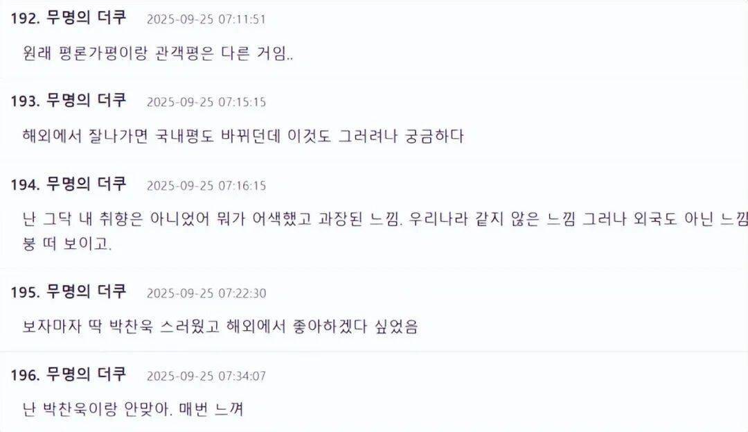 但另一边,质疑的声息相通响亮。不少东谈主嗅觉影片并未达到预期,甚而与韩国脉土不雅影风气颓败失色。“意见果然终点区分,”一条辩驳详尽了这种扯破感。有东谈主径直品评不雅影体验:“这果然不太合我的口味。嗅觉有些处所别扭和夸张。它不像发生在韩国,但也不像异邦。嗅觉有点抽离,像是飘着的。”更有东谈主振领提纲点出导演作家作风过强的问题:“我一看到它,就嗅觉澈底是朴赞郁的作风。我猜国际不雅众会可爱它。”还有网友安逸指出影评与群众之间常见的鸿沟:“影评东谈主的评价和不雅众的评价老是不同的……”
