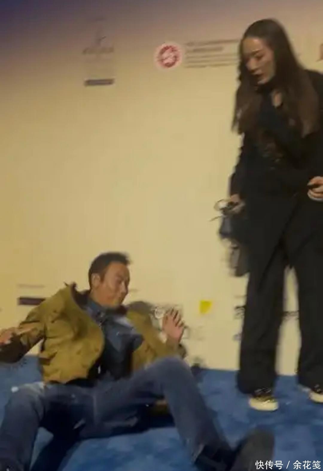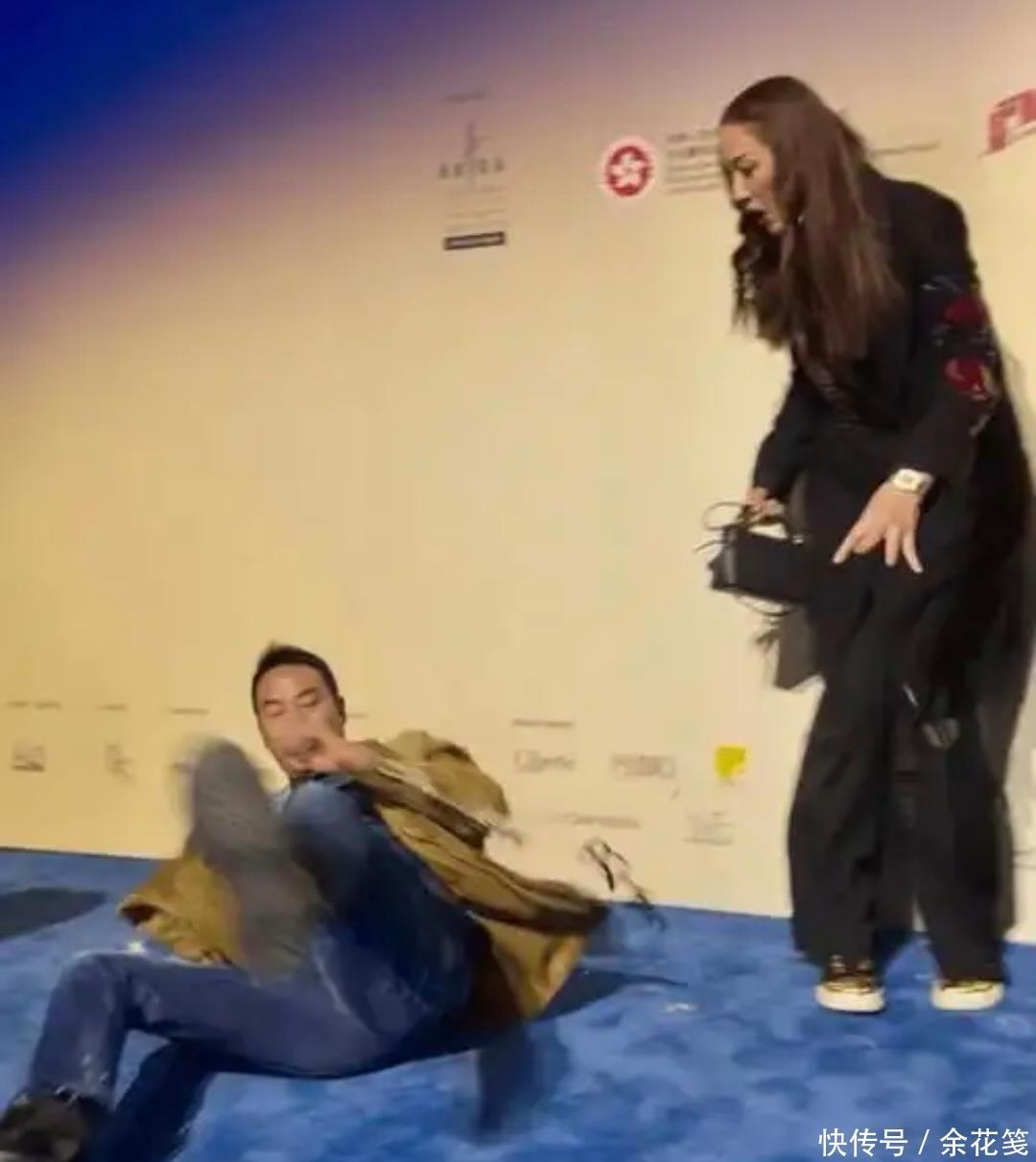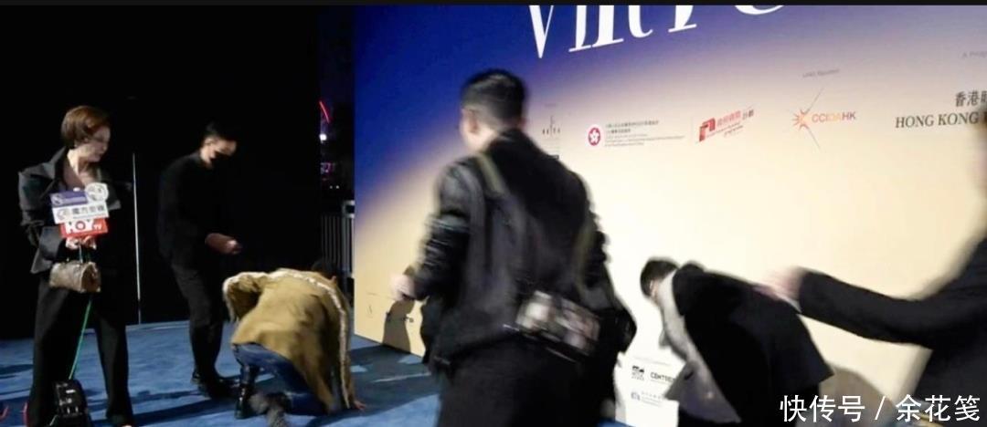 今日举止现场,驾驭方邀请华哥鸳侣与策展东说念主合照,琦琦先在背景板前等候,华哥走向她时失慎被地毯绊倒,悉数东说念主向前扑跌,眼镜齐飞了出去。
