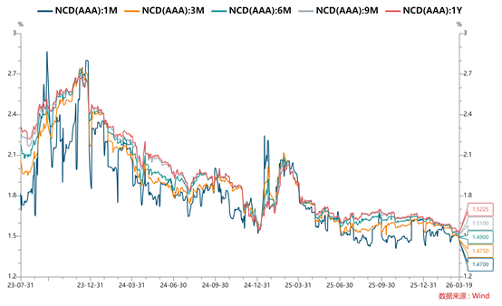 世界和主要股份制银行一年期同行存单二级市集上最新成交在1.5225%隔壁。